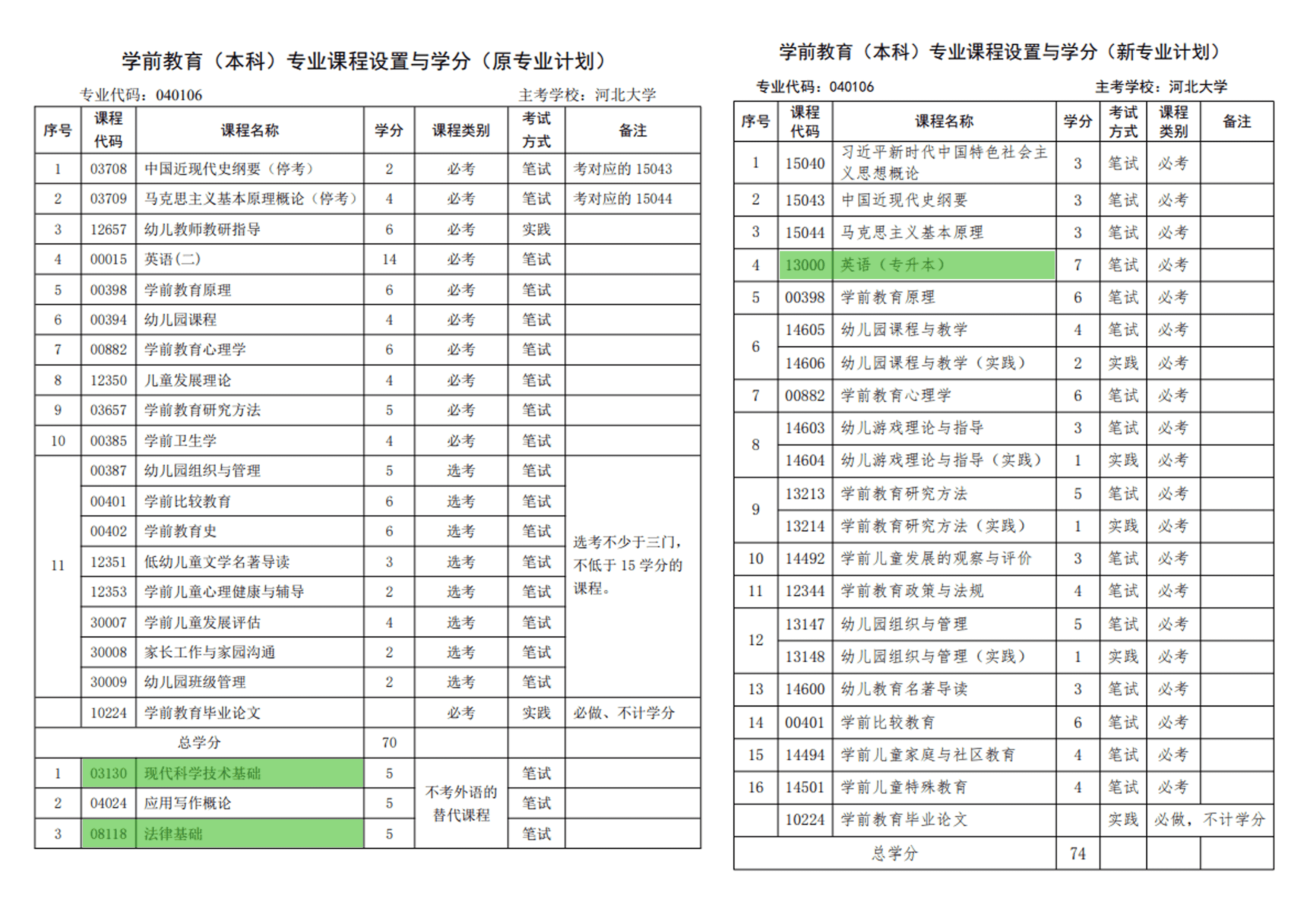 举例:学前教育(本科)专业某考生,已通过原计划中的“现代科学技术基础(03130)‘’和“法律基础(08118)”两门课程,可对应顶替新计划中的”英语(专升本)(13000)”,如下图绿色部分所示。