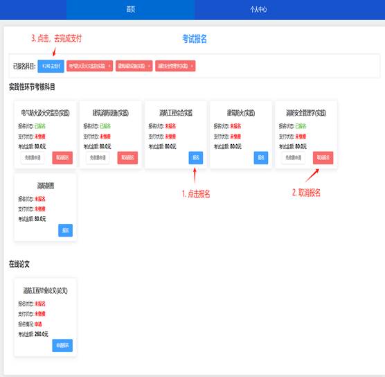 (一)考生登录中国人民警察大学继续教育官网(https://www.cppu.edu.cn/jxjy/);点击右侧“教学教务管理平台”栏目中的“自考报名缴费平台”后点击“2026年上半年高等教育自学考试消防工程(专升本)专业实践性环节考核和毕业论文(设计)报名缴费”端口进入高等教育自学考试实践性环节虚拟仿真考核系统页面。