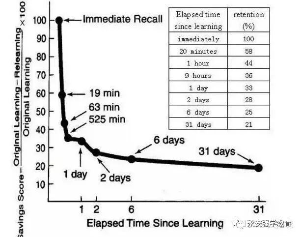 德国有一位著名的心理学家名叫艾宾浩斯,他在1885年发表了他的实验报告:实验者记忆100个生单词,刚刚记忆完毕,实验者的记忆量达到了100 %,仅隔了20分钟,记忆量下降到58.2%,过了一天后,记忆量只剩下1/3。